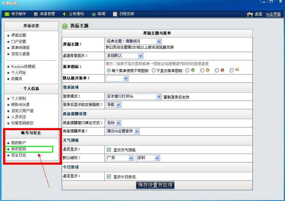 (4)OA地址(內(nèi)網(wǎng))修改成下面內(nèi)容[changanwuye.gicp.net:800]。用戶名首次登陸為自己的名字,沒(méi)有密碼。點(diǎn)擊保存。就可以直接登錄了。