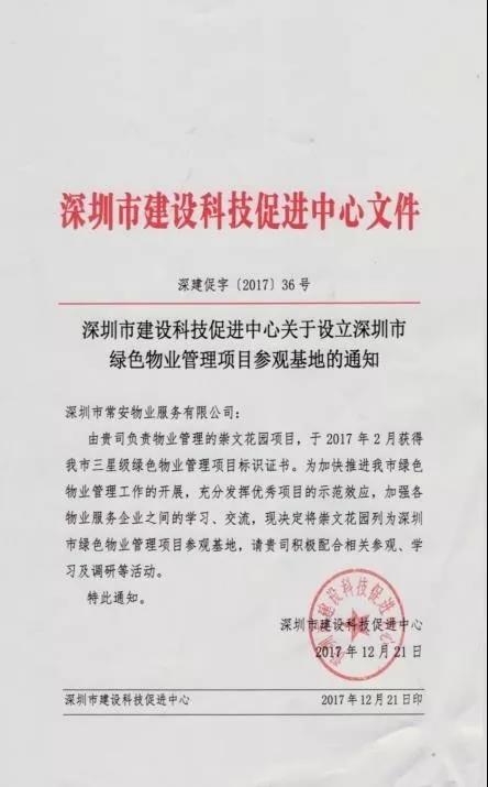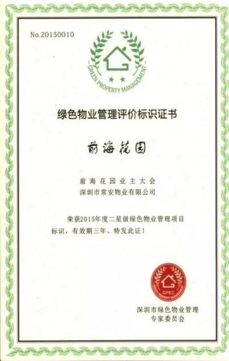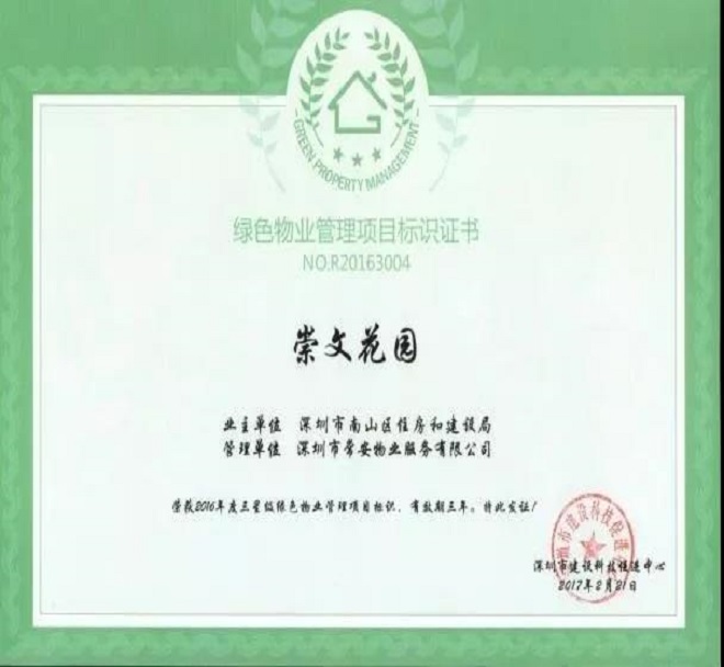 依據(jù)2011 年深圳出臺的首部《深圳市綠色物業(yè)管理導(dǎo)則(試行)》和 2013 年出臺的《深圳市綠色物業(yè)管理項(xiàng)目評價辦法和細(xì)則(試行)》,常安物業(yè)積極響應(yīng)并開展綠色物業(yè)管理工作,2016 年至今,共有四個項(xiàng)目榮獲了深圳市政府部門頒發(fā)的綠色物業(yè)管理項(xiàng)目證書,其中崇文花園還被深圳市政府部門列為深圳市綠色物業(yè)管理項(xiàng)目參觀基地,2019年出任廣東省綠色供應(yīng)鏈協(xié)會綠色物業(yè)管理專業(yè)委員會副主任委員單位。色物業(yè)管理