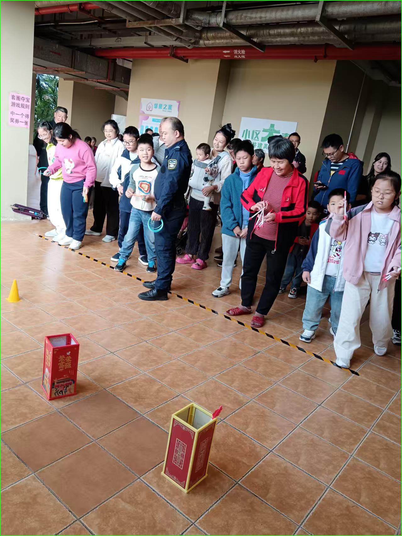 趣味套圈游戲:地上整齊擺放著各種小禮品,業(yè)主們手拿套圈,瞄準(zhǔn)心儀的目標(biāo),每當(dāng)套中獎(jiǎng)品,臉上便綻放出喜悅的笑容。