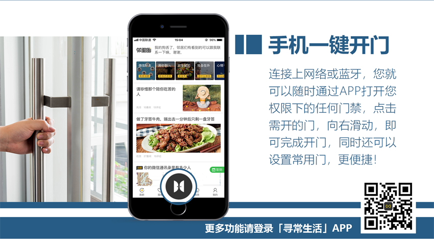 連接上網(wǎng)絡(luò)或藍牙,您就可以隨時通過APP打開您權(quán)限下的任何門禁,點擊需開的門,向右滑動,即可完成開門,同時還可以設(shè)置常用門,更便捷!